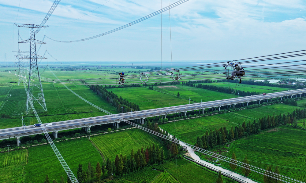國(guó)家電網(wǎng)江蘇宿遷供電公司檢修人員在500千伏泗上線安裝防舞動(dòng)相間間隔棒,提高供電可靠性。