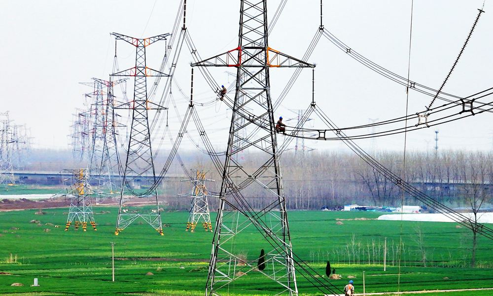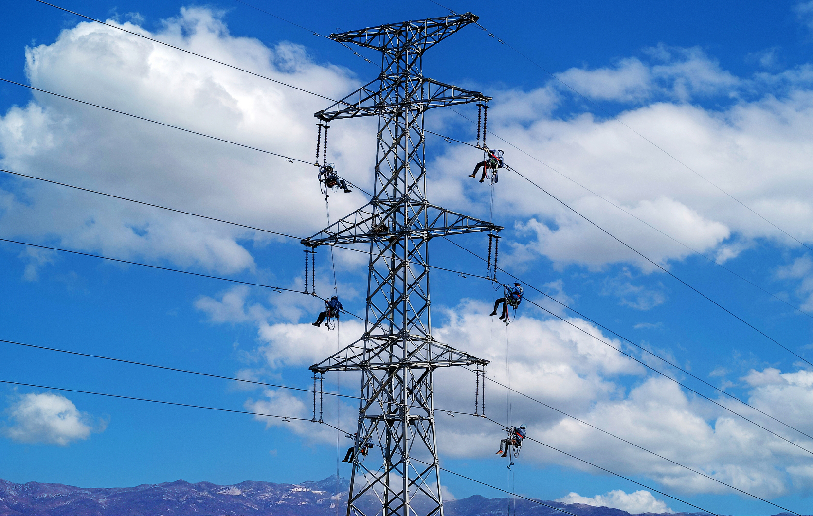 圖為國(guó)家電網(wǎng)山東威海供電公司工作人員在110千伏榮蜊線安裝防舞動(dòng)間隔棒,確保度冬期間電網(wǎng)穩(wěn)定運(yùn)行。