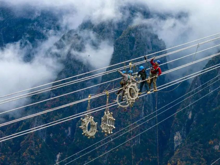國(guó)網(wǎng)四川電力施工人員開(kāi)展川渝特高壓工程輸電線路間隔棒安裝作業(yè)