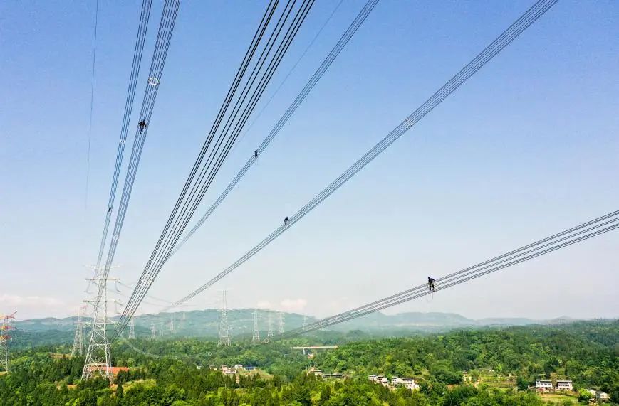 國(guó)網(wǎng)重慶送變電公司員工在川渝特高壓工程重慶段線路開(kāi)展走線消缺