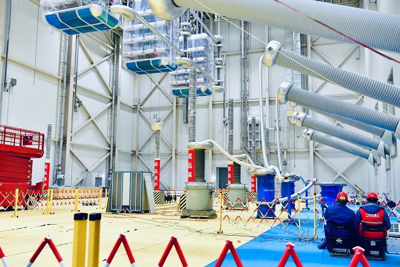 國網(wǎng)山東電力員工在±800千伏東平換流站開展換流變壓器試驗工作