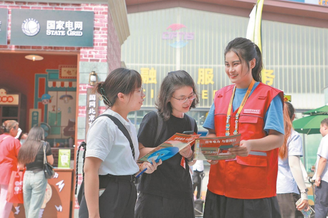 9月5日,國(guó)網(wǎng)北京電力客服中心員工在服貿(mào)會(huì)現(xiàn)場(chǎng)向觀眾介紹綠色用電知識(shí)。楊永鈴 攝