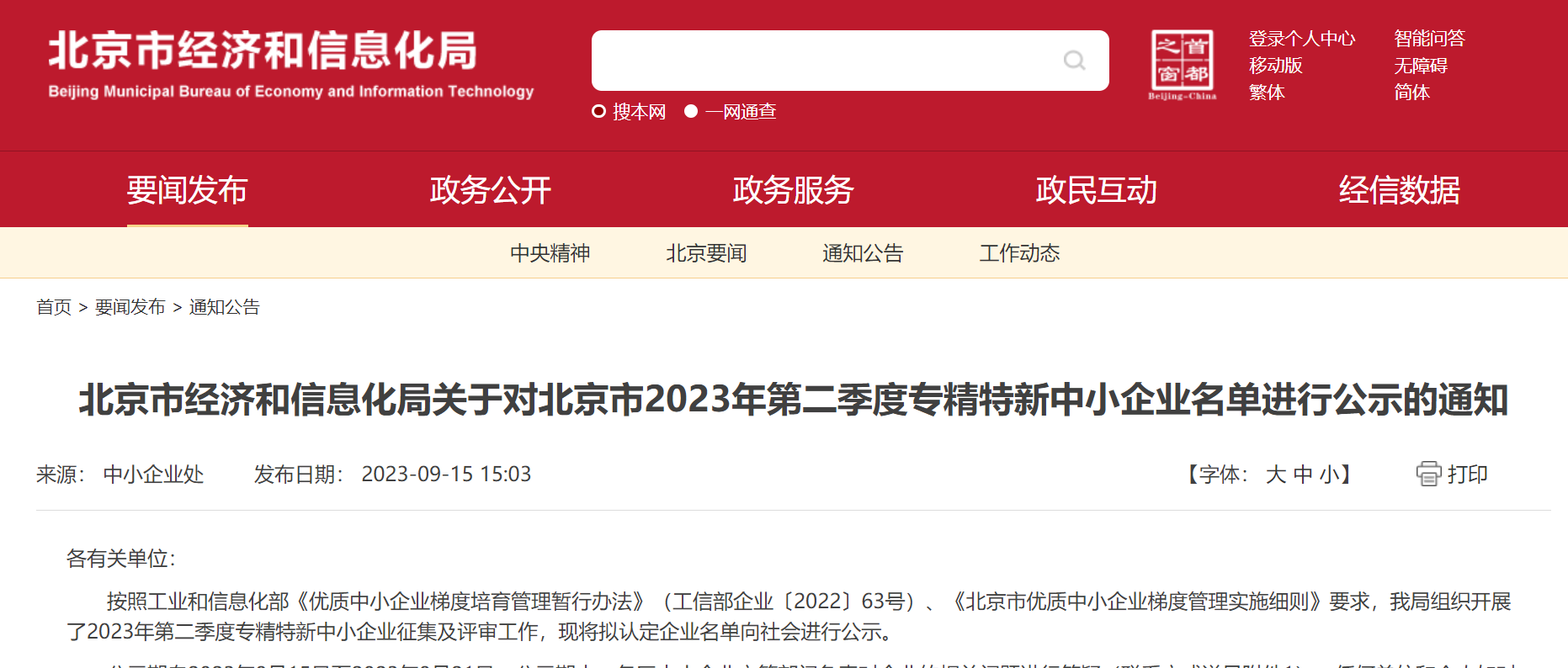 中國電力網(wǎng)訊(通訊員 時君柳) 9月15日,北京市經(jīng)濟和信息化局公布了《關(guān)于對北京市2023年第二季度“專精特新”中小企業(yè)名單進行公示的通知》,國網(wǎng)信通產(chǎn)業(yè)集團國電通憑借行業(yè)專業(yè)化、技術(shù)創(chuàng)新力、服務(wù)精細(xì)化從眾多參選企業(yè)中脫穎而出,獲得2023年度北京市“專精特新”中小企業(yè)榮譽稱號。