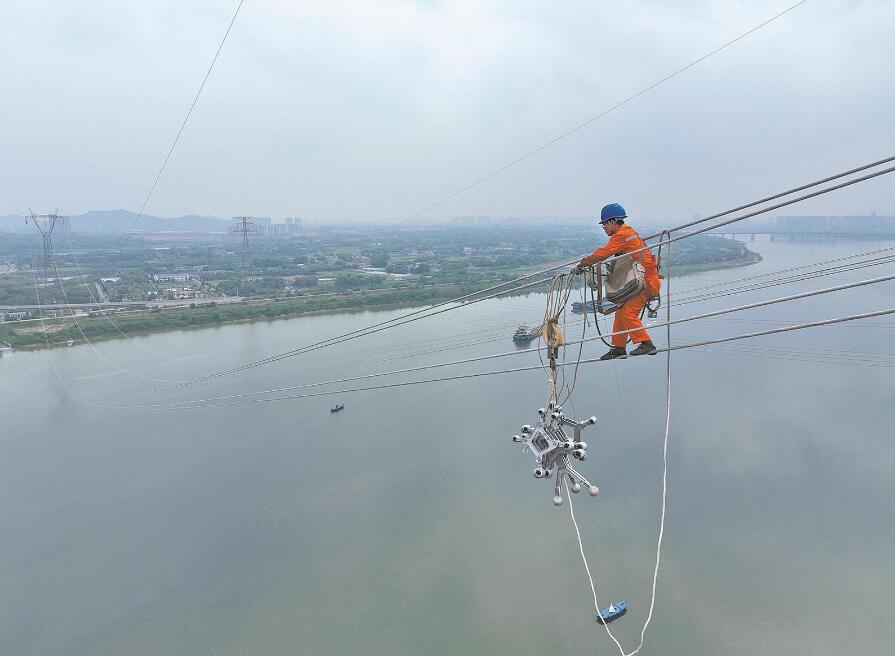 國(guó)網(wǎng)山東電力員工在白鶴灘—浙江±800千伏特高壓直流輸電線路開(kāi)展走線驗(yàn)收作業(yè)
