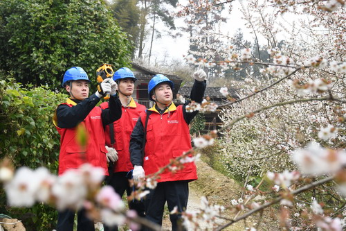 踏上蜿蜒的小路,穿過層層梅花林,國網福州供電公司共產黨員服務隊隊員們正輕車熟路地沿著高空銀線查看線路走廊,并對線路進行日常的巡視測溫,以確保村落的供電可靠性,保障村民的生活用電需求。“我們在巡視過程中會重點防范鳥害和樹線矛盾帶來的季節(jié)性安全隱患。”隊員王蘇宇介紹道。