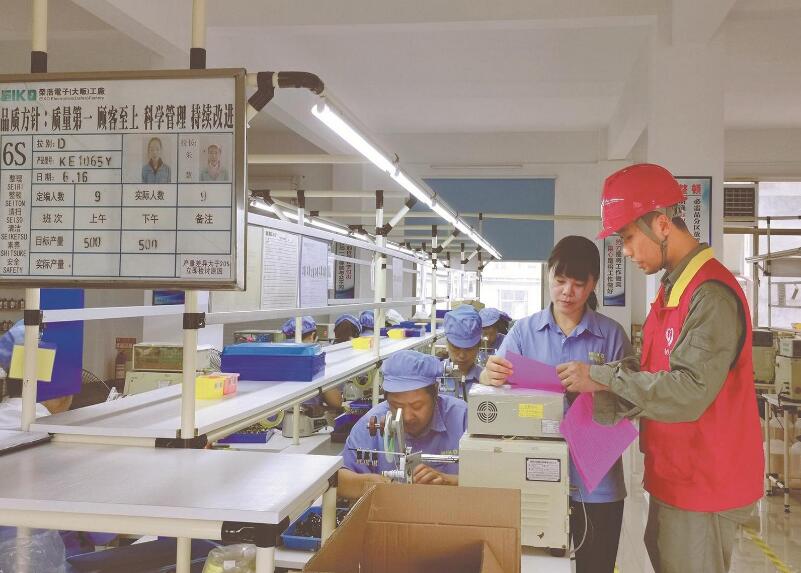 黨員服務(wù)隊隊員來到湖北榮浩電子有限公司,為流水線上的工人講解安全用電知識。程建僑 攝