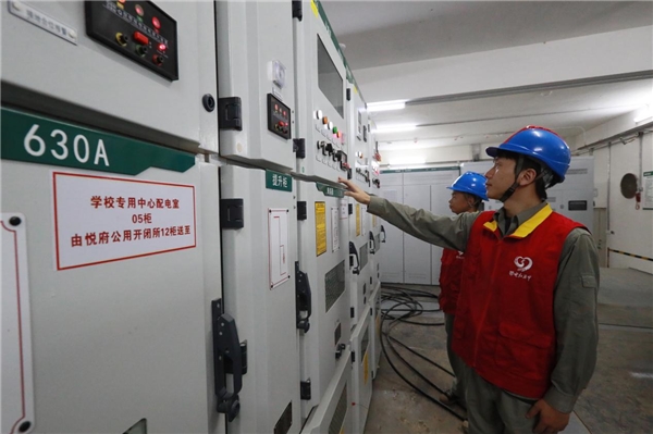 與此同時,在黃陂區(qū)第一中學(xué),服務(wù)隊員仔細查看了校園內(nèi)的用電設(shè)備使用情況。由于暑假期間學(xué)校的電氣設(shè)備大多處于閑置無負荷狀態(tài),加之夏季高溫、暴雨等多種因素影響,開學(xué)后校園用電負荷將大幅增長,容易導(dǎo)致用電設(shè)備出現(xiàn)短路、漏電等安全隱患。服務(wù)隊員根據(jù)學(xué)校的實際情況,逐一檢查校內(nèi)配電室的高低壓柜、變壓器、備用電源以及教學(xué)樓、食堂等處的用電線路及用電設(shè)備,對學(xué)校內(nèi)部線路絕緣老化、進出線連接不規(guī)范、開關(guān)接觸不良等問題及時處理,積極配合校方進行整改,確保學(xué)校用電設(shè)備在開學(xué)之前全部正常運轉(zhuǎn)。“根據(jù)咱們學(xué)校的用電負荷特點,我們優(yōu)化了供電線路的布局,也合理調(diào)整了變壓器的運行檔位,制定了詳細的專項保供電方案,并與學(xué)校建立聯(lián)動機制,確保開學(xué)時的正常供電。”服務(wù)隊員一邊進行安全用電檢查,一邊對學(xué)校后勤相關(guān)負責(zé)人說道。