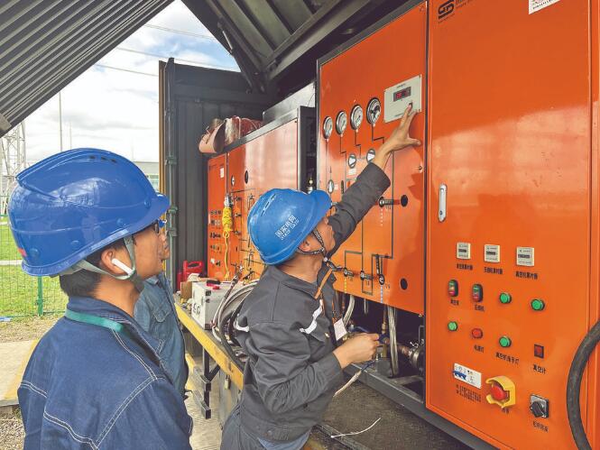 “7510斷路器套管安裝完畢,準(zhǔn)備抽真空,7512斷路器開始補氣。”9月19日,在位于甘肅平?jīng)霾莘彐?zhèn)的750千伏涼乾Ⅰ線檢修現(xiàn)場,檢修人員開展新安裝斷路器的抽真空和補氣作業(yè),目前該線路斷路器更換正有序推進。