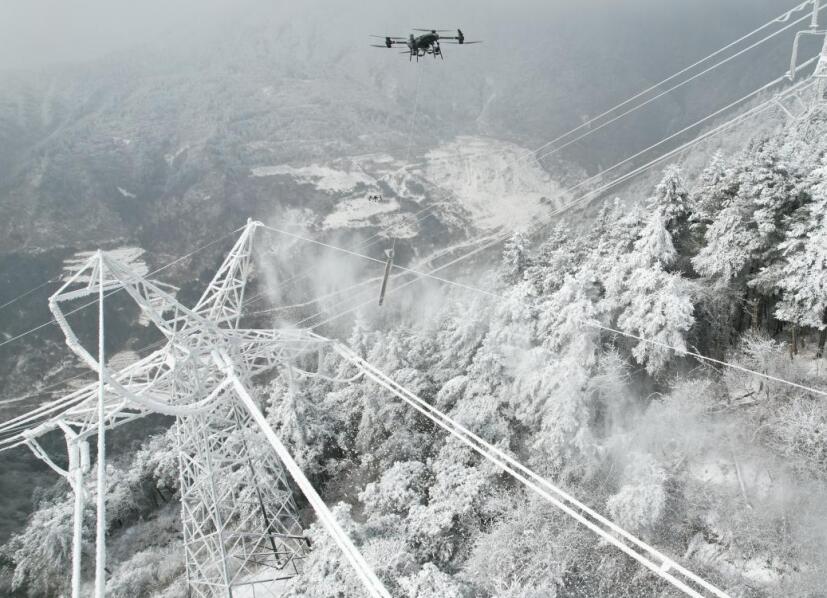 在海拔2800米的雅安市漢源縣蓑衣嶺,氣溫降至零下7℃,連接雅安至樂山的220千伏漢音輸電線路覆冰厚度已達(dá)10毫米。國網(wǎng)雅安供電公司組織電力運(yùn)維人員持續(xù)開展冰情監(jiān)測,運(yùn)用無人機(jī)搭載除冰裝置撞擊覆冰導(dǎo)線完成帶電除冰,及時消除輸電線路安全隱患。