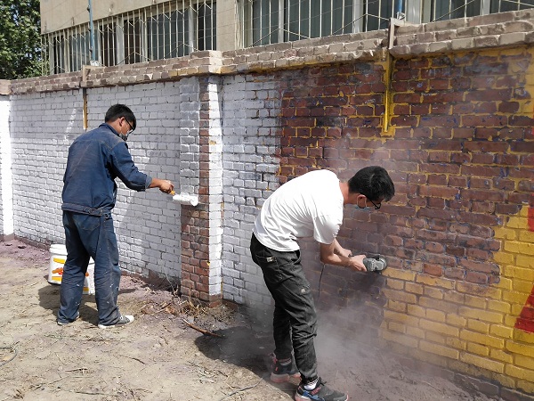 烈日當(dāng)頭,33℃的高溫絲毫沒有影響到大家干活的熱情。修繕路基的男生們和著水泥、手拿磚塊堆砌出一條筆直的長線;清理墻面的男生也不甘示弱拿著鋼絲刷,拎著裝滿油漆的白桶、滾筒刷來到圍墻外清理墻面;打掃庭院的女孩們拿著手中的勞動工具攀高爬下、忙忙碌碌。到了午休時(shí)分,為保質(zhì)保量完成任務(wù),張志龍,作為墻面清理負(fù)責(zé)人的他,選擇獨(dú)自留下,汗水一遍又一遍打濕他身穿的工作服,各色的粉塵混合著白色的油漆落在他的身上。他說:“今天雖然很累很辛苦,但看到俺們自己的勞動成果,能給大家創(chuàng)造好的環(huán)境,我覺得很有意義”。言辭之間,他充滿著自豪和快樂。直到晚上快十點(diǎn),完成門口的墻面粉刷任務(wù),幾個(gè)人才帶著一身的泥土回家吃飯。