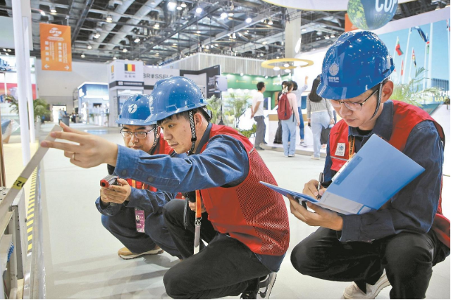 ?8月31日,朝陽(yáng)供電公司國(guó)家會(huì)議中心“1+N”保障團(tuán)隊(duì)隊(duì)員在國(guó)家會(huì)議中心(一期)服貿(mào)會(huì)展廳巡查設(shè)備并測(cè)溫。翟磊 攝