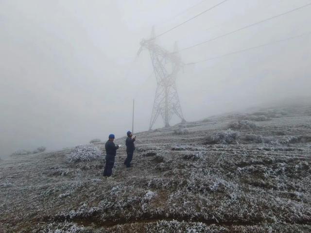 12月16日,南方電網(wǎng)工作人員在貴州畢節(jié)220千伏烏威線7號塔開展覆冰觀測,掌握輸電線路運(yùn)行情況。翟勇 攝