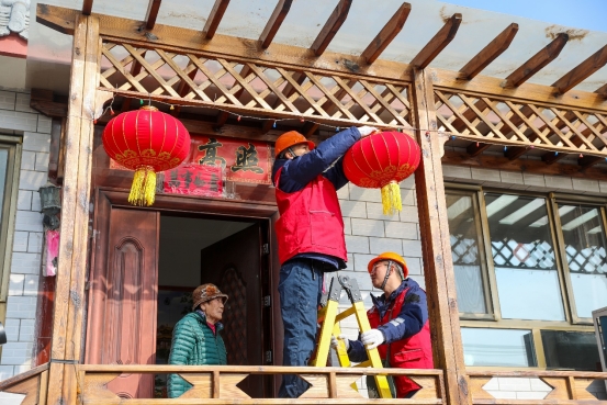 2月6日,國(guó)網(wǎng)北京門頭溝供電公司妙峰山供電所員工在炭廠村開展春節(jié)保電走訪,到獨(dú)居老人家檢查“煤改清潔能源”用電設(shè)備,幫助掛紅燈籠。(張文靜 攝)