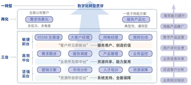 以“三臺兩化一轉(zhuǎn)型”為抓手,全面推進(jìn)現(xiàn)代供電服務(wù)體系建設(shè),不斷優(yōu)化前、中、后臺協(xié)同運作機(jī)制,暢通企業(yè)內(nèi)循環(huán)。實體化中臺建設(shè)穩(wěn)步推進(jìn),“基礎(chǔ)+增值”用電服務(wù)產(chǎn)品不斷豐富,服務(wù)效率不斷提升、用戶獲得感、幸福感和安全感不斷增強(qiáng)。