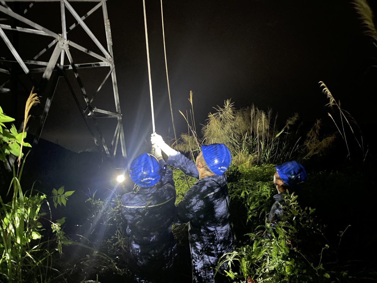 4月20日晚,南方電網(wǎng)廣西新電力集團(tuán)岑溪供電公司搶修人員在山間開展35千伏大歸線20號(hào)塔C相絕緣子遭雷擊脫落接地故障搶修工作。通訊員 韋銳 攝