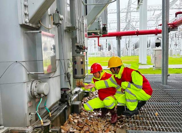20日中午,在1000千伏練塘站,站長兼支部書記周勇趁著雨勢(shì)稍微減小再一次帶領(lǐng)運(yùn)維人員來到戶外設(shè)備區(qū)開展特巡,檢查特高壓主變運(yùn)行情況。連著中秋假期,周勇與站里的黨員們已經(jīng)連續(xù)奮戰(zhàn)了近一周,雖然很疲憊,但大家的目標(biāo)都是一致的——全力確保變電站可靠供電。