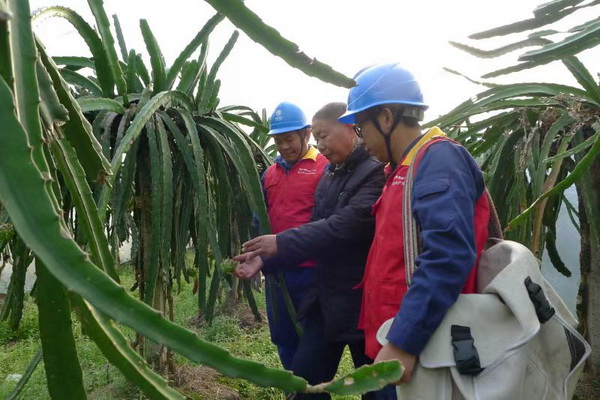 2018年,一場大病之后,袁珍寶放下了村書記的擔(dān)子,但又組織村里的幾位病弱村民和退伍軍人承包140多畝土地建起了火龍果基地。在創(chuàng)建初期,橋頭胡供電所的共產(chǎn)黨員服務(wù)隊以最快的速度完成了基地供電,并義務(wù)為基地敷設(shè)噴灌管道,安裝電動農(nóng)藥噴霧器,在電氣化農(nóng)用設(shè)備保障下,火龍果基地第二年就獲得了200多萬元的收入?;瘕埞麖纳L到成熟期間,都需要殺蟲,這都離不開電力的保障。“昨天,我們的電動噴霧器不知什么原因壞了,上午一直在查,多虧有你們電力‘紅馬甲’上門服務(wù),幫我們解除了困難,真是‘雪中送炭’啊!”袁珍寶笑得滿臉生花。