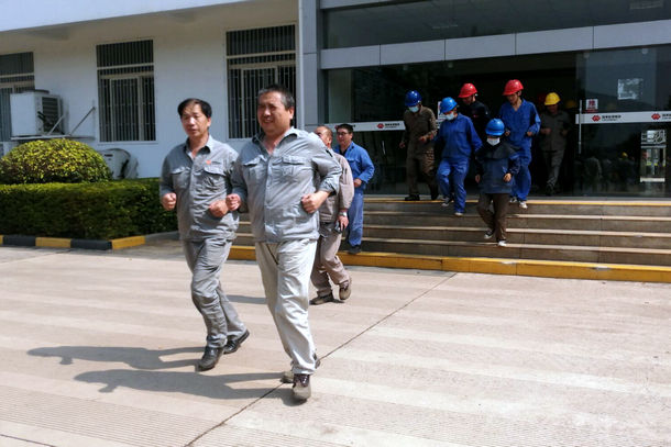11時(shí)20分,演練活動(dòng)正式開始。隨著地震模擬信號(hào)(哨音)發(fā)出,辦公樓、輸煤綜合樓內(nèi)的員工立即就地躲避在三角區(qū)或內(nèi)墻角等牢固地點(diǎn),用雙手保護(hù)頭部,等地震減弱后,快速、安全、有序地撤離到指定區(qū)域。