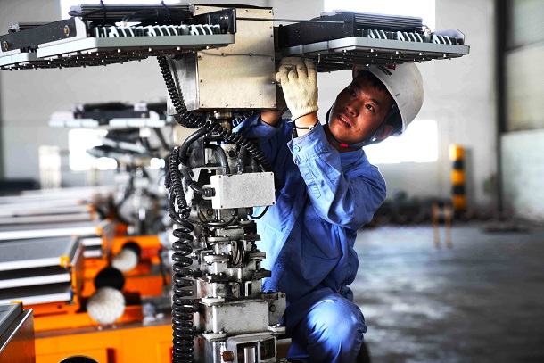 圖為作業(yè)人員在篩分車間檢修移動照明燈