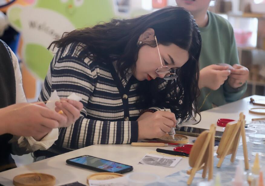 活動中大家興致勃勃地上手在木質(zhì)杯墊上制作琺瑯畫,用細(xì)膩柔軟的金絲,貼在裝飾圖紋上,通過配色、填沙等步驟,逐步制作出一件件別具一格、匠心獨制的藝術(shù)作品,大家興趣盎然,彼此交流,共同分享動手制作的體會和收獲的喜悅,共品非遺藝術(shù)魅力。掐絲琺瑯工藝是一種傳統(tǒng)的中國手工藝,用金屬細(xì)絲掐出圖案后填充各種顏色的琺瑯彩料,經(jīng)過多道工序,制成精美器物。本次體驗活動進(jìn)行掐絲琺瑯手工杯墊制作,作品可以永久保存,永不褪色,并具有很好的觀賞性和收藏價值。