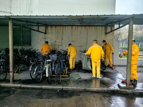 隨后,全體成員分為兩組分別對修舊利廢場地和自行車棚進(jìn)行分類、歸整和清掃。大家手抬肩扛,分工明確,將各項物資和自行車有序定置擺放。