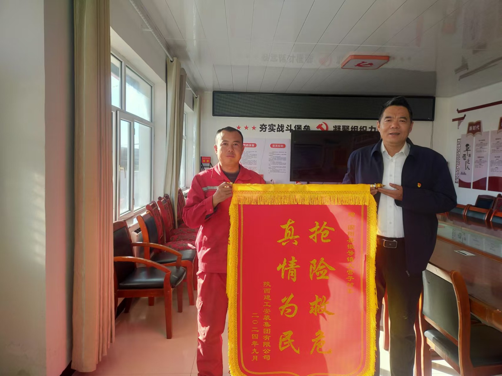 圖為陜西建工安裝集團(tuán)負(fù)責(zé)人到大營子村送錦旗