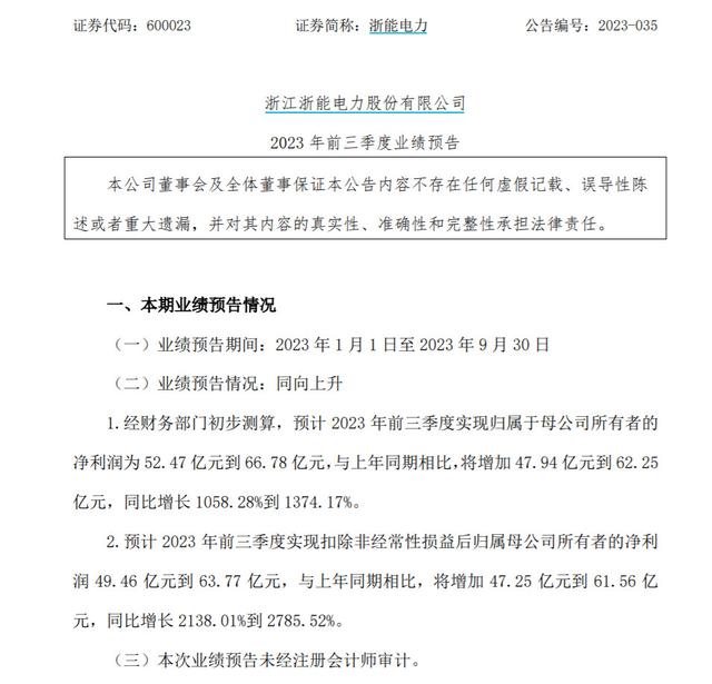 浙能電力:預(yù)計(jì)前三季凈利同比增超1000%