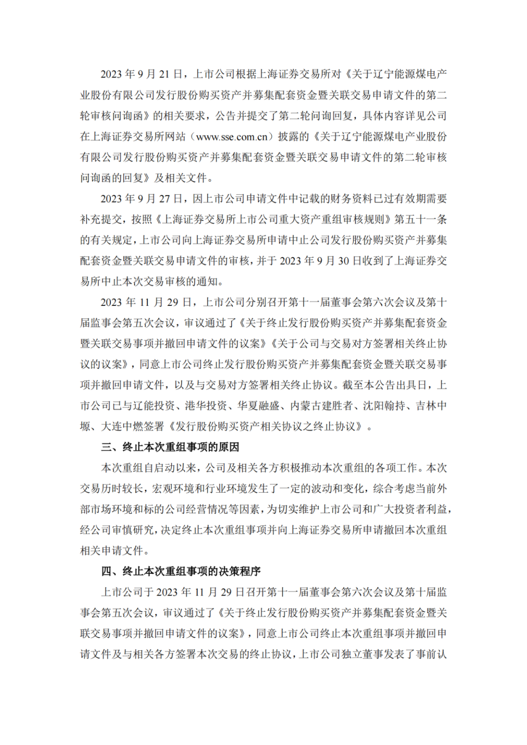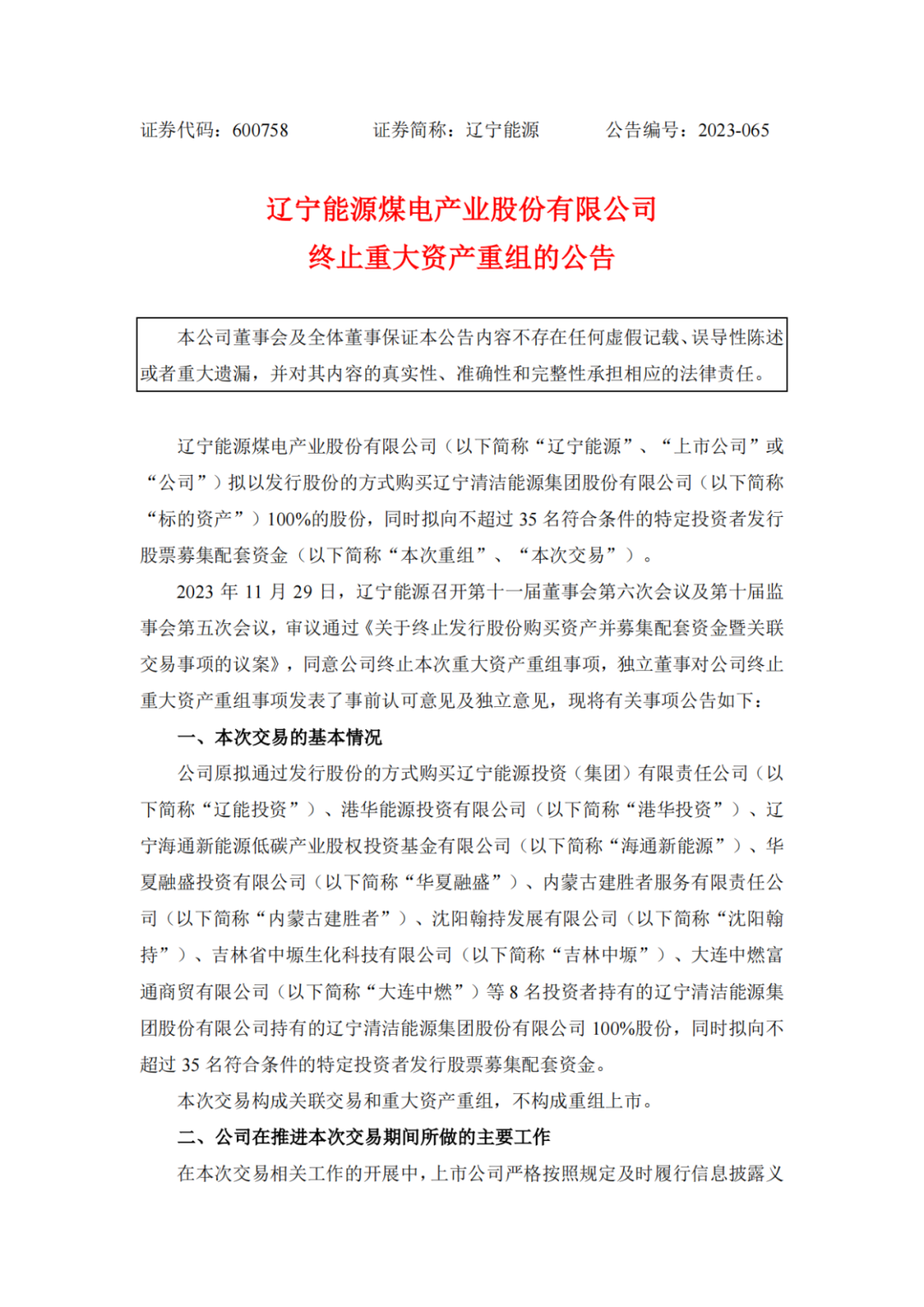 11月30日,遼寧能源發(fā)布關(guān)于終止重大資產(chǎn)重組的公告。
