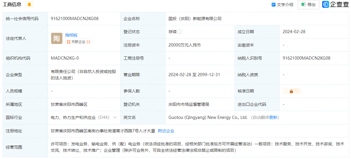 2月28日,國投(慶陽)新能源有限公司成立,法定代表人為陶相棟,注冊資本為20000萬元人民幣。