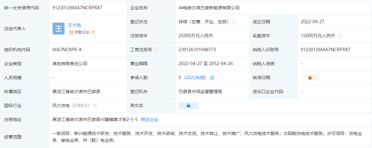 企查查顯示,4月28日,華電(哈爾濱)新能源有限公司成立,法定代表人為鄭勇斗,注冊(cè)資本1000萬(wàn)人民幣,經(jīng)營(yíng)范圍含新興能源技術(shù)研發(fā)、風(fēng)力發(fā)電技術(shù)服務(wù)、太陽(yáng)能發(fā)電技術(shù)服務(wù)、儲(chǔ)能技術(shù)服務(wù)等。該公司由華電能源(600726)全資持股。