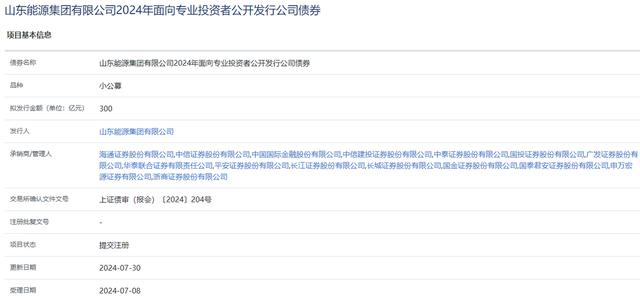 上交所債券項(xiàng)目信息平臺(tái)顯示,山東能源集團(tuán)有限公司2024年面向?qū)I(yè)投資者公開發(fā)行公司債券項(xiàng)目,最新的狀態(tài)為“提交注冊(cè)”,更新日期為2024年7月30日。