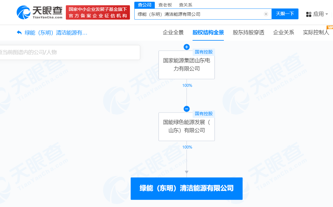 股權(quán)全景穿透圖顯示,該公司由國能綠色能源發(fā)展(山東)有限公司全資持股,后者由國電電力間接全資持股。