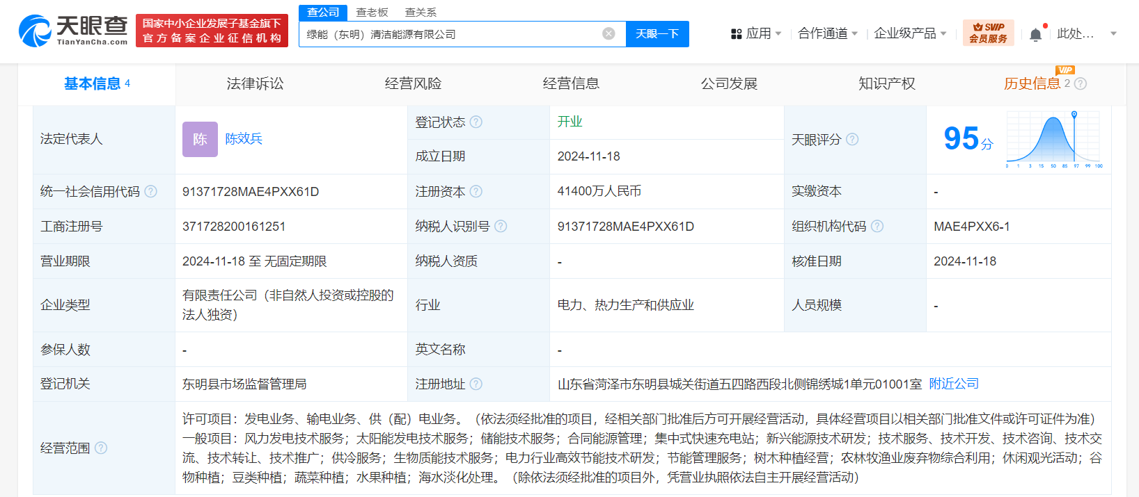 天眼查App顯示,近日,綠能(東明)清潔能源有限公司成立,法定代表人為陳效兵,注冊資本4.14億元,經(jīng)營范圍含發(fā)電業(yè)務(wù)、輸電業(yè)務(wù)、供(配)電業(yè)務(wù),風(fēng)力發(fā)電技術(shù)服務(wù),太陽能發(fā)電技術(shù)服務(wù),儲能技術(shù)服務(wù),集中式快速充電站,新興能源技術(shù)研發(fā)等。