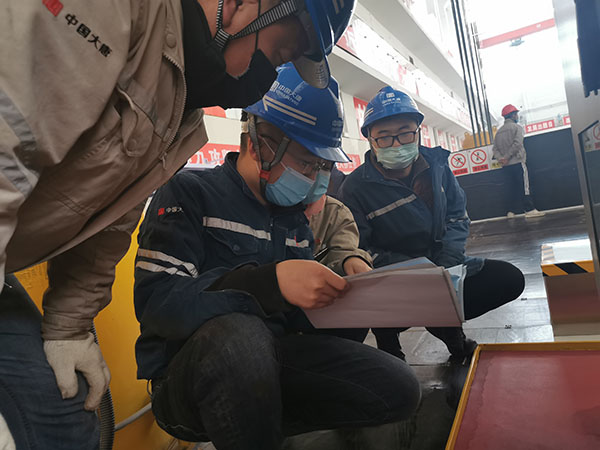 張博(左一)為青年職工講解轉(zhuǎn)輪支架縫隙測試儀使用方法