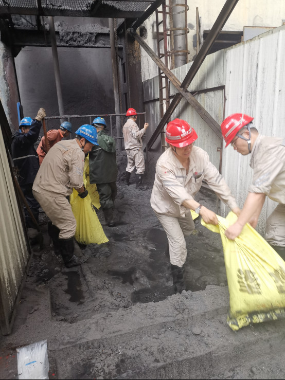 上午10時(shí),暴雨加劇,主機(jī)集控室開始大量漏水,吊頂部分塌落,下方的電子設(shè)備間漏水嚴(yán)重,部分參數(shù)失真;汽機(jī)房外的廠內(nèi)主路積水達(dá)50公分;煤溝進(jìn)水;廠前區(qū)全部停電、大門外波濤洶涌;墻外從山上下來的山洪更是濁浪排空。危急關(guān)頭,首陽(yáng)山項(xiàng)目部20余名黨員干部職工積極參與防汛行動(dòng),用沙袋堵塞缺口,加固堤壩,險(xiǎn)情逐漸消除。17時(shí),首陽(yáng)山發(fā)電公司運(yùn)煤通道路基塌方,燃煤運(yùn)輸中斷。險(xiǎn)情就是命令!面對(duì)只有兩天用量的煤炭庫(kù)存,項(xiàng)目部人員積極參與到首陽(yáng)山發(fā)電公司抗洪搶險(xiǎn)隊(duì)伍中,共筑防汛抗洪“同心堤”。經(jīng)過連續(xù)八個(gè)小時(shí)團(tuán)結(jié)奮戰(zhàn),燃煤供應(yīng)線路逐步恢復(fù),大唐人抵抗住了偃師幾十年罕見的暴雨襲擊,為地方抗洪搶險(xiǎn)、保障城市安全電力貢獻(xiàn)了力量。