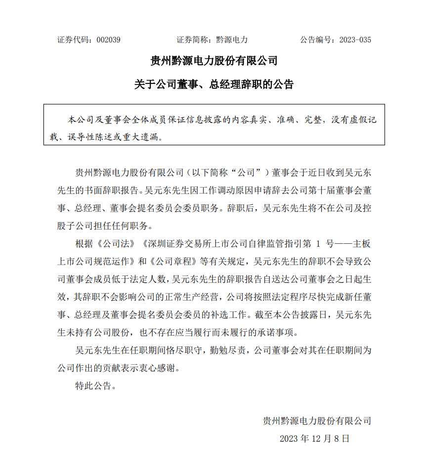 黔源電力12月8日發(fā)布公告稱,公司董事會于近日收到吳元東先生的書面辭職報告。吳元東先生因工作調(diào)動原因申請辭去公司第十屆董事會董事、總經(jīng)理、董事會提名委員會委員職務(wù)。辭職后,吳元東先生將不在公司及控股子公司擔任任何職務(wù)。