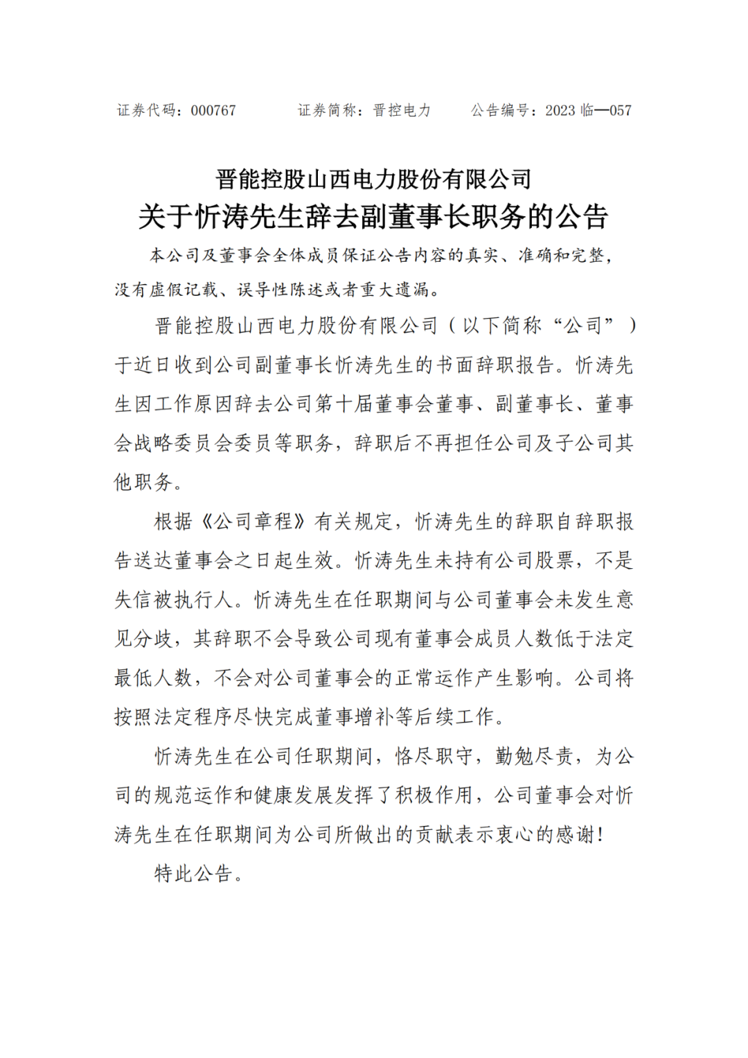 12月12日,晉控電力發(fā)布公告稱,于近日收到公司副董事長忻濤的書面辭職報(bào)告。忻濤因工作原因辭去公司第十屆董事會(huì)董事、副董事長、董事會(huì)戰(zhàn)略委員會(huì)委員等職務(wù),辭職后不再擔(dān)任公司及子公司其他職務(wù)。