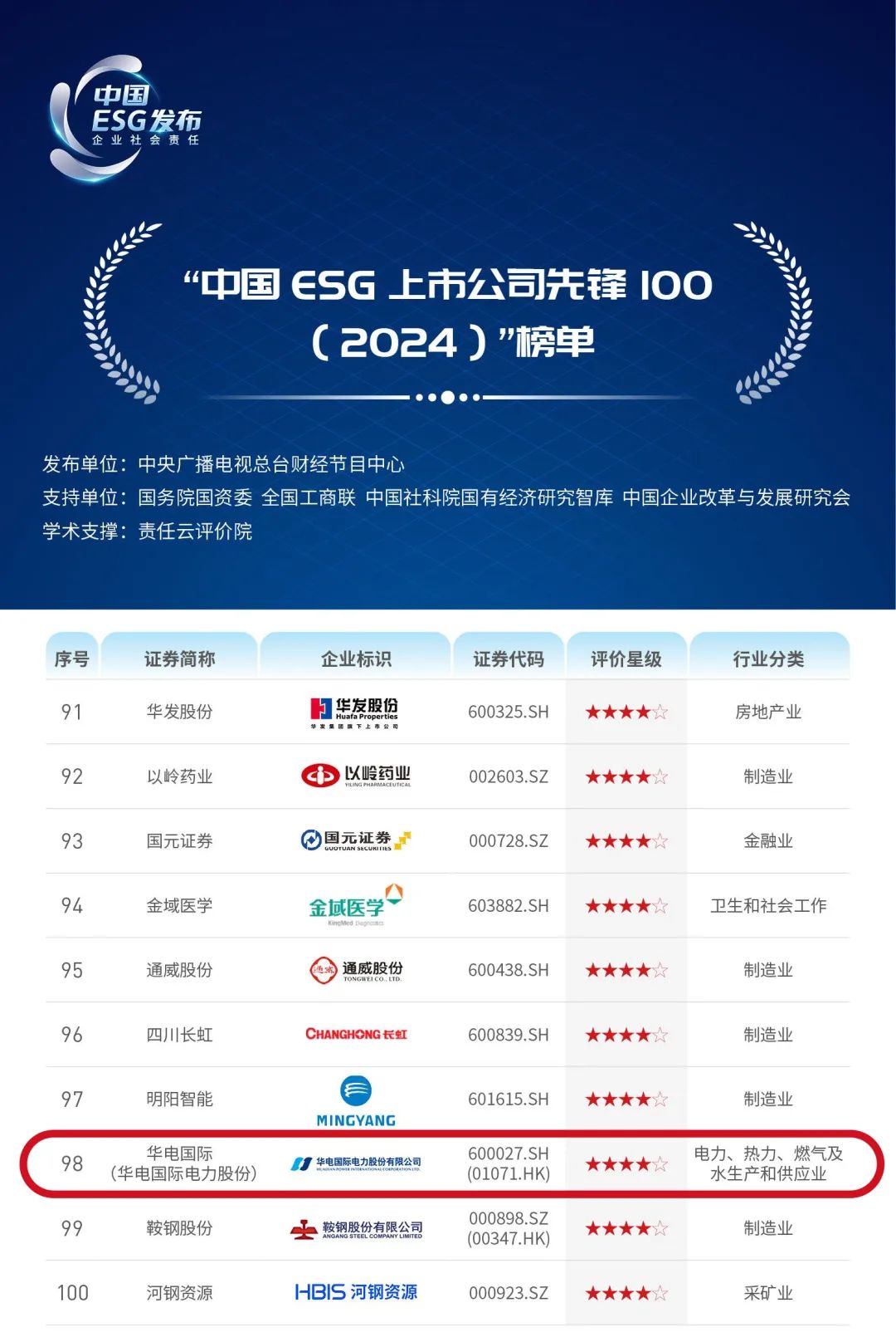6月30日下午,中央廣播電視總臺財經(jīng)節(jié)目中心聯(lián)合國務(wù)院國資委、全國工商聯(lián)、中國社科院國有經(jīng)濟(jì)研究智庫、中國企業(yè)改革與發(fā)展研究會在京正式發(fā)布“中國ESG(企業(yè)社會責(zé)任)《2024年度ESG行動報告》”?!秷蟾妗饭剂?ldquo;中國ESG上市公司先鋒100”榜單,中國華電所屬華電國際電力股份有限公司成功入圍。