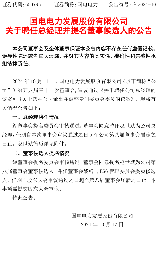 2024年10月11日,國電電力召開八屆三十一次董事會,審議通過《關于聘任公司總經(jīng)理的議案》《關于選舉公司董事并調整專門委員會委員的議案》。經(jīng)董事會提名委員會審核通過,董事會同意聘任趙世斌為公司總經(jīng)理,任期自本次董事會審議通過之日起至公司第八屆董事會屆滿之日止。經(jīng)董事會提名委員會審核通過,董事會同意提名趙世斌為公司第八屆董事會董事候選人,并任董事會戰(zhàn)略與ESG管理委員會委員候選人,任期自股東大會審議通過之日起至第八屆董事會屆滿之日止。