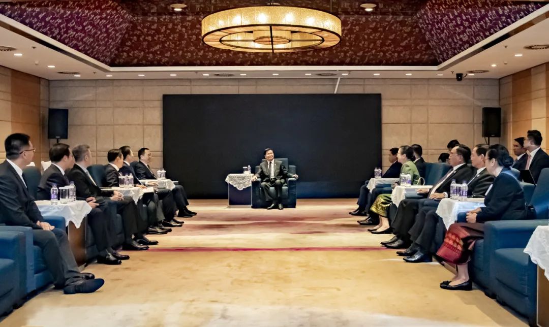 中國大唐黨組成員、副總經理彭勇,老撾副總理兼外交部部長沙倫賽·貢瑪西,老撾中央辦公廳主任坎瑪尼·彭謝娜,中老合作委員會主席塞斯納參加會談。