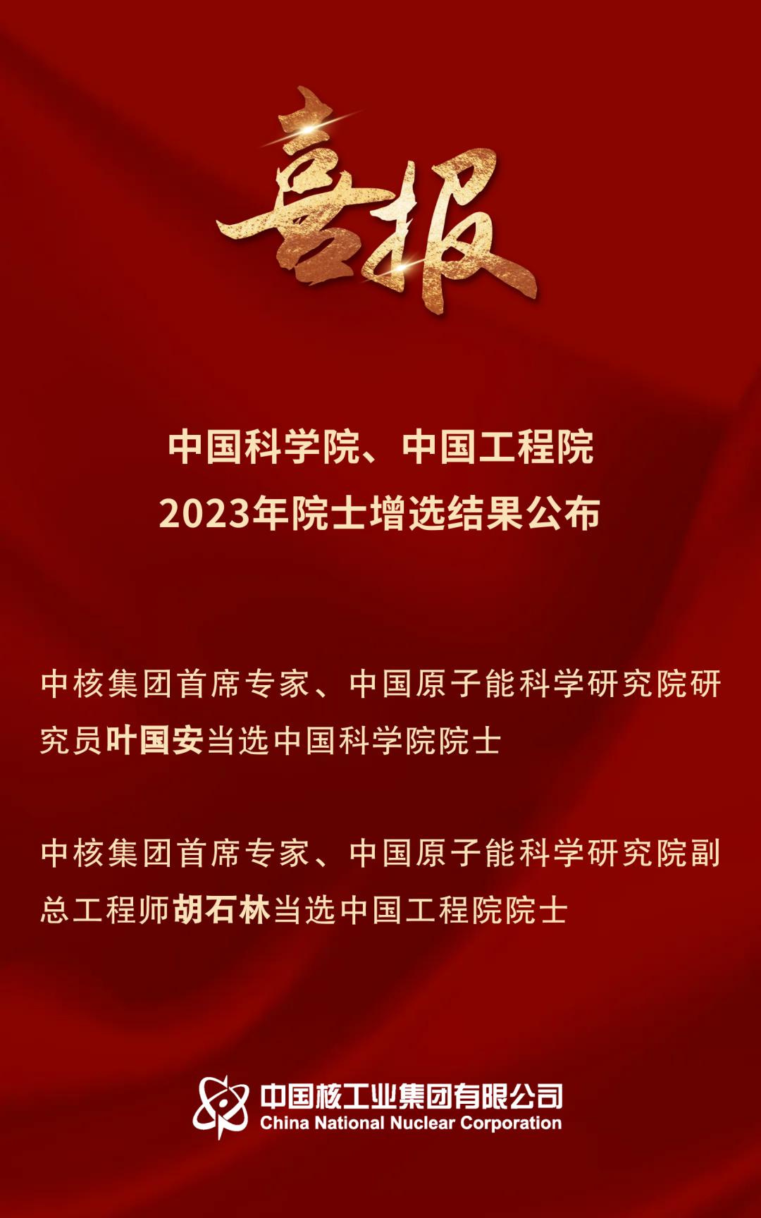 11月22日,2023年兩院院士增選結果正式揭曉,中核集團首席專家、中國原子能科學研究院研究員葉國安當選中國科學院院士;中核集團首席專家、中國原子能科學研究院副總工程師胡石林當選中國工程院院士。