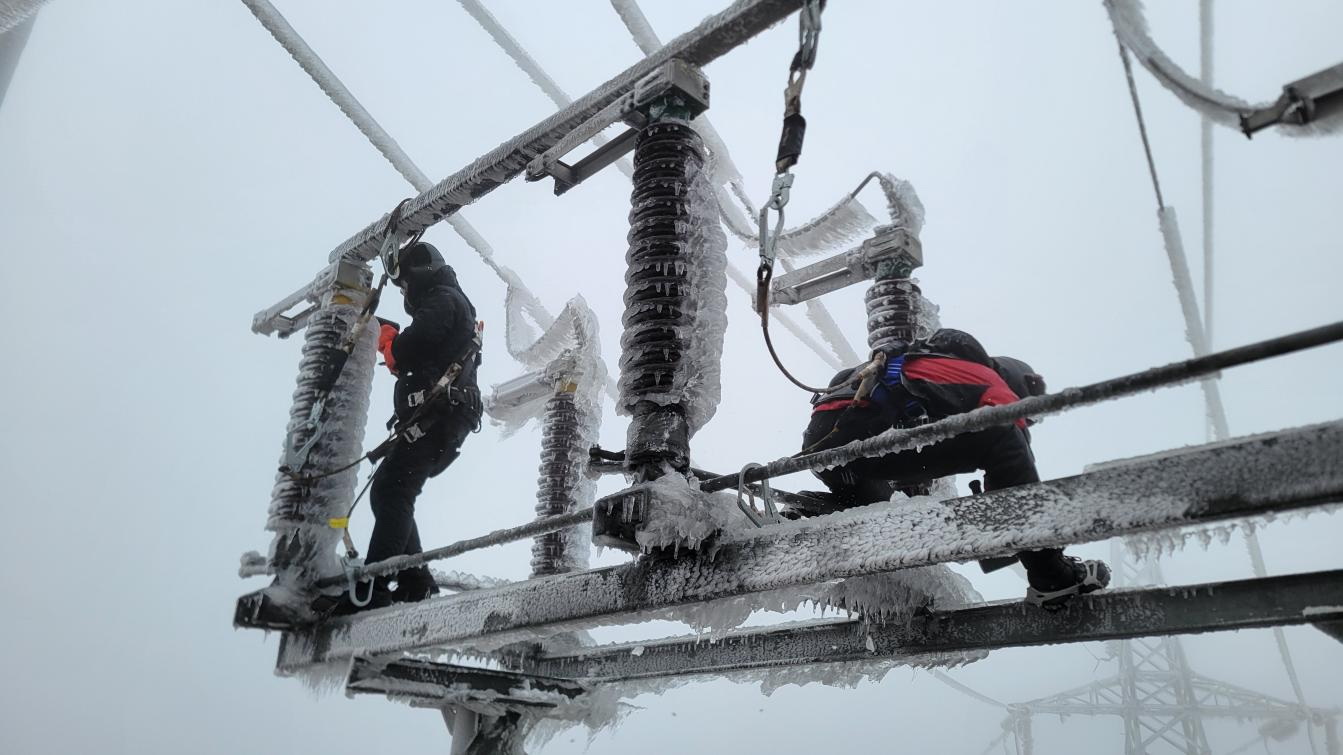 圖為湖南公司黃甲嶺風(fēng)電場運(yùn)維人員在刀閘上進(jìn)行除冰操作