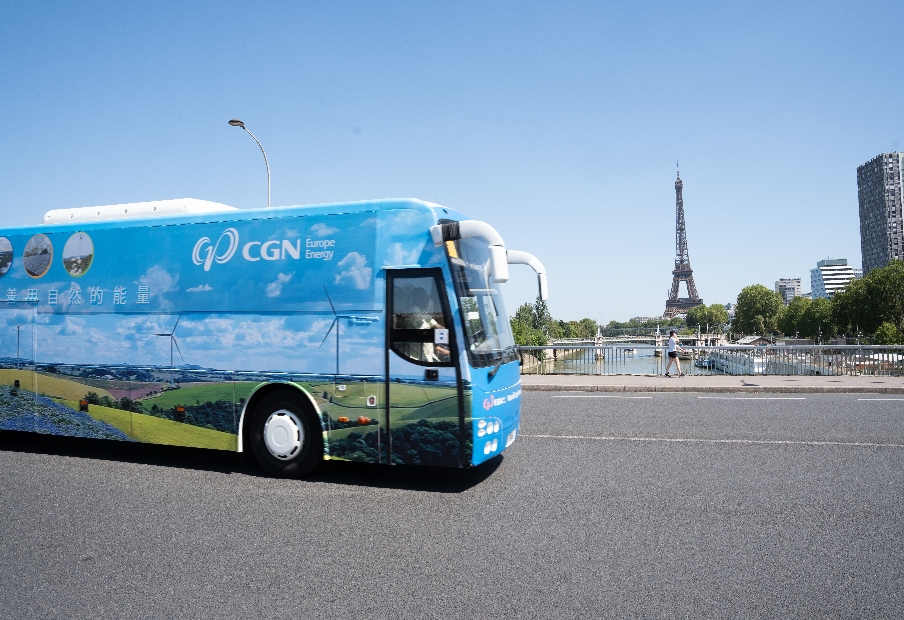 印有中廣核風場的旅游大巴穿梭在巴黎街頭