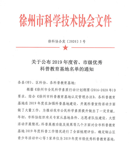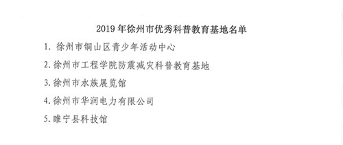 中國電力網訊 近日,徐州市科協(xié)發(fā)布《關于公布2019年度省、市級優(yōu)秀科普教育基地名單的通知》(徐科協(xié)辦發(fā)﹝2020﹞5號),公司在72家科普教育基地中脫穎而出,被評為2019年徐州市優(yōu)秀科普教育基地,并獲得專項獎勵,是徐州市唯一一家獲得表彰的企業(yè)類科普教育基地。