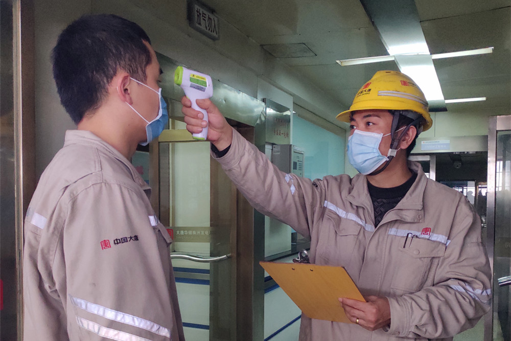 檢測體溫 方劍學(xué)是大唐華銀株洲發(fā)電公司發(fā)電部的一名集控運(yùn)行主操,每天他上班都要經(jīng)過兩次體溫測量和佩戴口罩檢查。在疫情發(fā)生的第一時(shí)間,該公司迅速落實(shí)戰(zhàn)“疫”保電工作要求,實(shí)行生產(chǎn)區(qū)崗哨、集控室準(zhǔn)入制,凡是進(jìn)入公司區(qū)域的人員必須先接受檢查,做到外防輸入、內(nèi)防傳播,確保職工生命安全和機(jī)組發(fā)電安全。