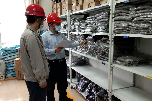 圖為該公司人員正在檢查職業(yè)危害防護用品配備情況