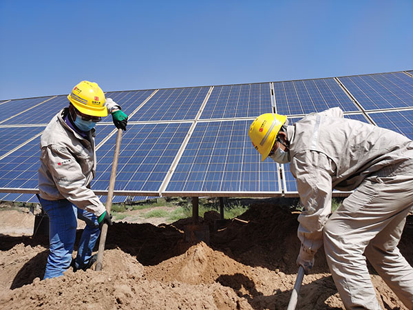 該光伏電站地處內(nèi)蒙古阿拉善烏蘭布和沙漠邊緣,現(xiàn)場土質(zhì)多為粉細(xì)砂,堅土層較薄,不利于光伏站內(nèi)箱式變壓器、逆變器、匯流箱及光伏組串等設(shè) 備基礎(chǔ)穩(wěn)固,特別在雨季時期,雨水對光伏組件基礎(chǔ)沖刷影響較大。該公司運(yùn)維人員及時開展光伏組件基礎(chǔ)土方回填工作,現(xiàn)場采用機(jī)械填土和人工補(bǔ)填方式進(jìn)行,一邊裝載車和挖掘機(jī)配合,將土方填至光伏板背光面,另一邊人工回填光伏板正下方區(qū)域。在控制土方高度時,運(yùn)維人員嚴(yán)格按照規(guī)范要求,夯實并填平土方,保證光伏方陣組件最下端與地面距離不低于0.3米,確保光伏板受光良好。在控制加固工期期間,該公司運(yùn)維人員早出晚歸、雷厲風(fēng)行,歷時兩天,順利完成任務(wù)區(qū)的基礎(chǔ)加固工作。