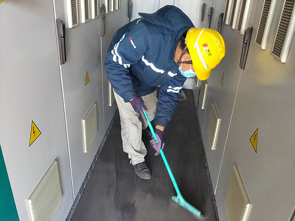 該電站毗鄰當(dāng)?shù)貫跆m布和沙漠,廠址周邊植被少,冬季多為大風(fēng)天氣,為防止光伏板被風(fēng)吹落,該公司運(yùn)維人員對(duì)光伏組件基礎(chǔ)進(jìn)行細(xì)致檢查,對(duì)相對(duì)薄弱的區(qū)域進(jìn)行埋石填土加固,對(duì)組件支架銹蝕的螺栓及時(shí)進(jìn)行更換,對(duì)傾斜的立柱進(jìn)行校正固定;站內(nèi)防凍措施已提前落實(shí),但隨著氣溫的降低,相關(guān)防護(hù)需要每日一檢,該公司運(yùn)維人員對(duì)生活水井的保暖措施進(jìn)行再加固,在井蓋上方罩住多層保溫被,隔離井口積水,為閥門制作防護(hù)罩,保證生活用水正常供應(yīng),同時(shí)對(duì)電暖氣和空調(diào)開(kāi)展全面檢查,對(duì)用電負(fù)荷電流進(jìn)行鉗測(cè),避免過(guò)負(fù)荷故障和火災(zāi)事故;在主設(shè)備風(fēng)沙防治上,這群年輕人狠下功夫,他們每天在太陽(yáng)下山前開(kāi)好工作票,在太陽(yáng)下山后做好安全措施,集中清掃逆變器室和箱變室塵土和更換濾網(wǎng),每日清掃一組,一個(gè)月一輪回,解決逆變器及箱變積沉較多、散熱不良問(wèn)題;在送出線路檢查上,他們每日對(duì)17條站內(nèi)線路和1條送出線路進(jìn)行徒步巡線,細(xì)致檢查桿塔金具、導(dǎo)線、地線固定情況,并利用夜間停電機(jī)會(huì)及時(shí)消除異常隱患,保證涉網(wǎng)設(shè)備正常運(yùn)行。
