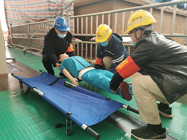 此次演練在主安裝廠2號機組大修現(xiàn)場進行,模擬兩名施工人員在轉(zhuǎn)輪支架3米多高的平臺上焊接縫隙,一名工作人員未系安全帶進行作業(yè),不慎摔倒墜落。該公司相關(guān)部門接到報告后,迅速啟動應(yīng)急機制,立即撥打120緊急電話,并通知應(yīng)急救援隊趕赴事故現(xiàn)場。救援現(xiàn)場,應(yīng)急隊員迅速判斷危險情況,并檢查傷員傷勢,大家齊心協(xié)力將傷員轉(zhuǎn)移到安全地帶,拉起警戒線,對傷員進行緊急檢查。救援人員發(fā)現(xiàn)傷者腿部骨折,無法行動,立即進行骨折包扎急救,按部就班、細(xì)致謹(jǐn)慎對傷口進行消毒、止血、固定、包扎。最后,傷員被順利送往醫(yī)院。