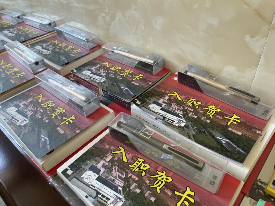 活動(dòng)現(xiàn)場,該公司領(lǐng)導(dǎo)為新員工發(fā)放“入職賀卡”“入職學(xué)習(xí)大禮包”并與他們合影留念。(周佩)